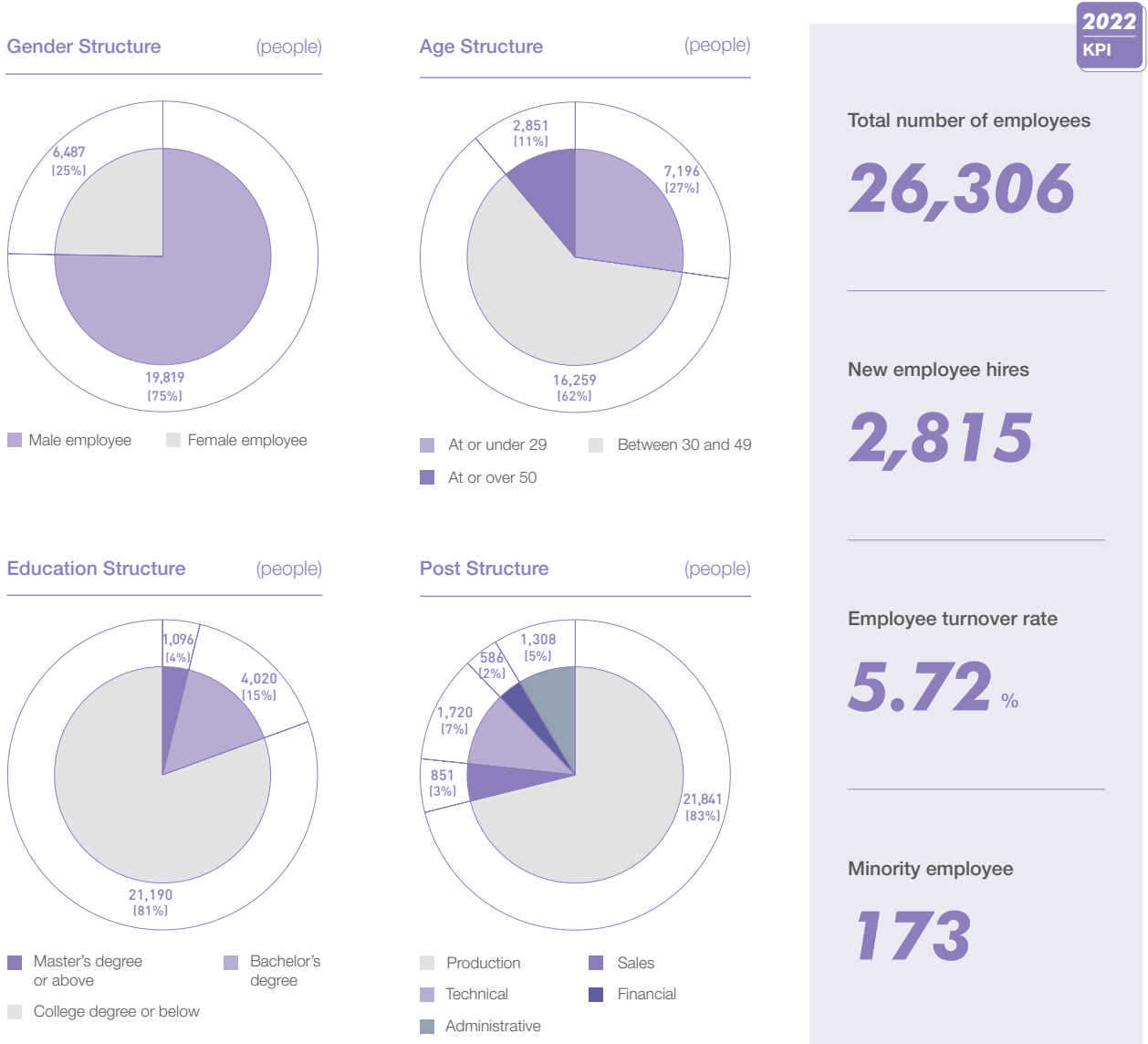 The company strictly abides by the laws and regulations of China and the various overseas regions it operates in, having formulated the Labor and Human Rights Policy. Upholding the “fair, equitable and transparent” principle of legally compliant employment, we value and safeguard the rights and interests of employees, respect their values, individuality and privacy, create a diverse, equal, and inclusive working environment, and build harmonious labor relations.