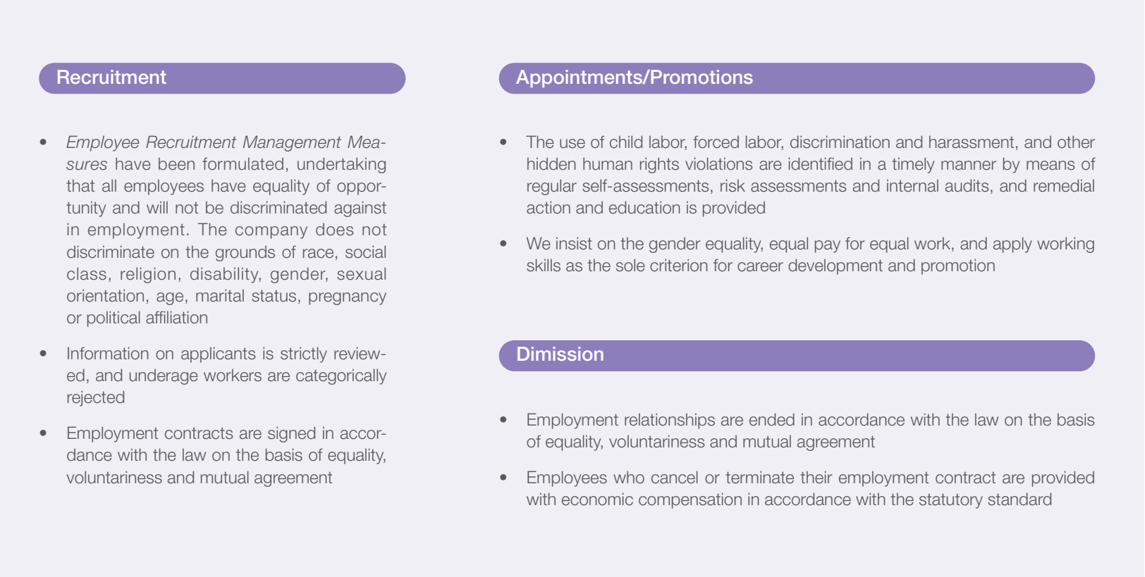 Sinochem International and all of its subsidiaries have signed a Letter of Responsibility for Standardized Employment, and insist on equality of employment, clearly prohibiting any discriminatory treatment of an employee for any reason. Harassment, child labor, and any form of forced labor are strictly prohibited. The company encourages and supports the employment and career development of women, ethnic minorities and the disabled, and promotes their group integration through measures such as the setting up of toilets for the disabled, and protection for pregnant women and their employment.